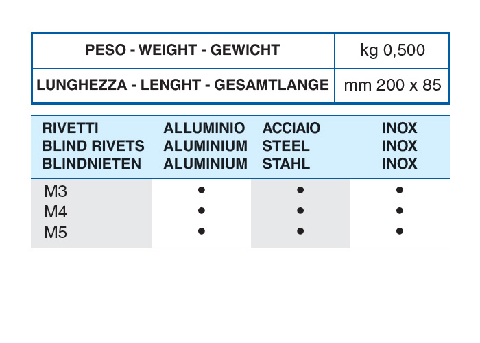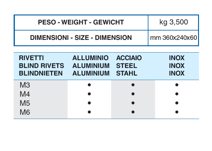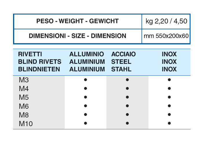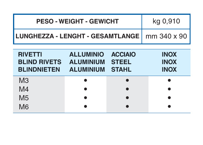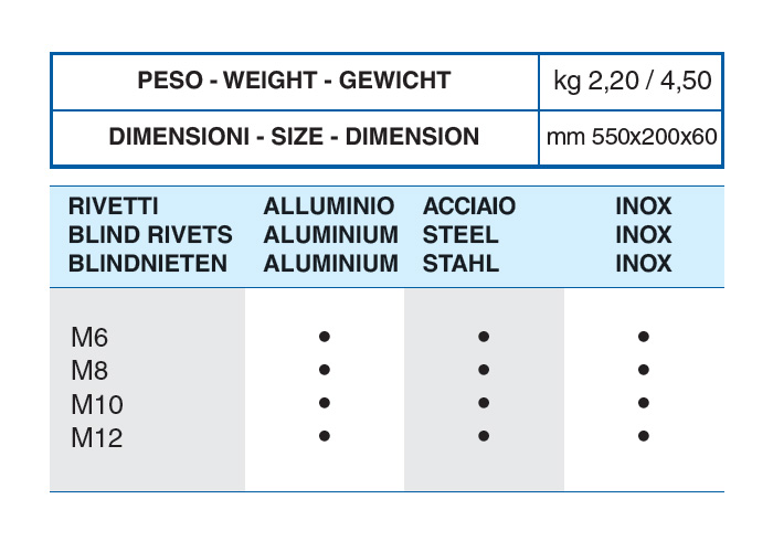Produciamo rivettatrici manuali per il fissaggio di rivetti e inserti dal 1974. I nostri modelli vanno dall'utensile manuale per il fai da te fino al prodotto più specifico per l'industria, attraverso la gamma più completa di rivettatrici manuali per tutte le esigenze. Forniamo inoltre rivettatrici pneumatiche, oleopneumatiche ed elettriche. Per tutti i modelli di rivettatrici a catalogo, offriamo il servizio di assistenza e riparazione e possiamo fornire direttamente al cliente i ricambi di cui necessita.